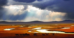 品北疆新韵,扬龙马精神。怀古扶今,朗朗月、灿灿星,旷阔碧野、绿草青青。天街⑥跃群骏,地表腾神龙。藏骅骝、匿骖騑、隐骕骦、蛰骐骥,习奔宵⑦野行万里似霹雳,崇超光⑧一形十影胜禽飞。旋大漠,驱云破雾。绘荒原,啸月嘶风。身居黄流黑水,珍视沃土桑田。骏足发愤驰千里,奋蹄不用再扬鞭。