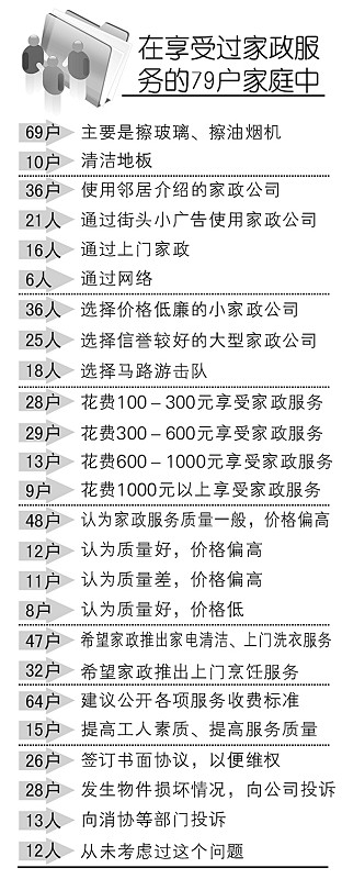 参与调查的100户居民中,79户居民接受过家政服务,21户没有接受过家政服务。接受过家政服务的居民中,46户是因工作忙没时间处理家务,约占享受家政服务人数的58%;33户是为了提高生活质量,约占享受家政服务人数的42%。而在没有接受过家政服务的家庭中,16户表示现行家政服务收费偏高,不值得花钱请人干活,约占76%;5户担心服务不到位,约占24%。在79户接受过家政服务的家庭中,对现有家政服务较满意的家庭仅占10%左右,其余家庭都对家政服务有不同的看法和意见。“15元钱就擦两块玻璃,100多平方米的房子,光擦玻璃就得二三百元,收费有点高。”家住煤气化公司宿舍的张女士,今年已年近六旬,退休后几乎每年春节前都自己擦玻璃、扫房子,除了清洗油烟机之外,很少请家政公司服务。参与此次调查的100户居民中,共有21户居民表示,没有用过家政公司,其中大部分人是因为家政服务收费偏高。某中学教师任女士表示,扫房子、清洁地面等家政服务项目都没有明确的收费标准,收多少钱,就凭工人一张嘴,着实让消费者心里没底。