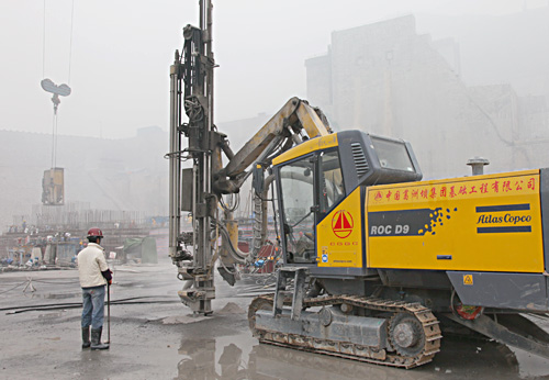 图为先进施工设备D9钻机在泄水渠坝段上进行固结灌浆钻孔施工场景。