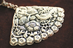 除镏金、珐琅彩外,海南银饰还喜欢与宝石、玉,甚至鹿骨等材质结合,以其他材质的价值拉升银饰的价格。