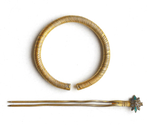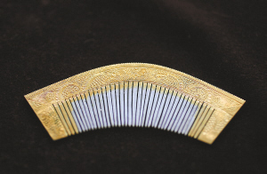 当地银饰与国内传统银饰的最大区别,在于镏金工艺。很多手镯、头簪、银梳上,都喜欢镏上一层薄薄的金箔,使银饰在素朴之外,恰到好处地多了几分华贵之气。日前,记者在省收藏家协会见到黎族孩童佩戴的鹿筋镏金手镯和一束镏金头簪。在鹿盘手镯的接口处,包上一层薄薄的金箔,既遮盖了对接的痕迹,又有装饰之美。镏金头簪则在簪头的花束上镶上金箔,这需要何等的精雕细刻!还有明清时代的镏金银梳,银质的梳齿细密有致,弧形梳把上是一层耀眼的镏金,上面雕刻的数条草龙栩栩如生。做工之精细美观,令人叹为观止。