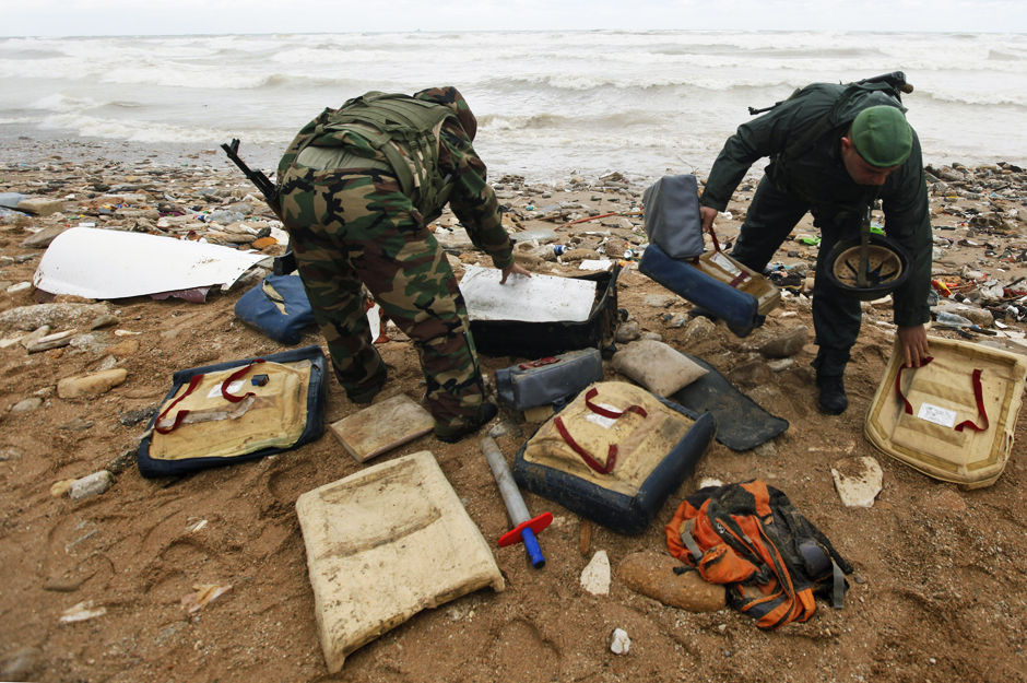 当地时间1月25日,黎巴嫩贝鲁特,黎巴嫩士兵在距贝鲁特机场不远的海边捡拾失事飞机残骸。