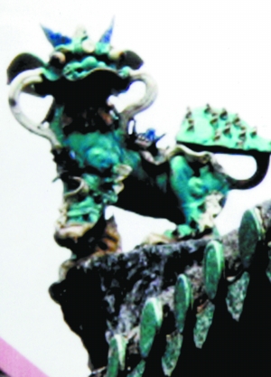 记者通过朱庆昌提供的原照片看到,该石狮系瓷瓦构造,通体光滑,狮头龙身,身体呈青色,腮毛白亮,造型威武状如猛虎下山。一对石狮体长20厘米,高40厘米,一左一右昂首立于祠堂屋顶两角。