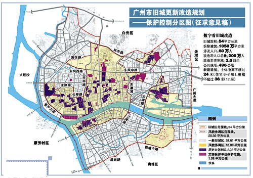 二、广州市旧城更新改造规划——保护控制分区图:该分区图总面积约54平方公里,主要针对旧城区建成时间超过30年的历史城区,划分为4个保护控制分区:(一)文物保护单位保护范围,总面积约1.08平方公里。(二)历史文化街区和近现代优秀建筑、工业遗产保护范围:总面积约3.23平方公里。(三)风貌协调区范围:总面积约20.39平方公里。(四)一般旧城区范围:总面积约33.61平方公里。市规划局依照相关法律和法定规划对上述地区的更新改造分别提出了规划保护和控制指标要求。