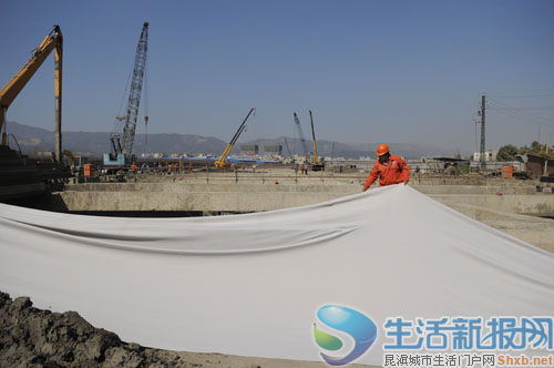 看到众多的记者在拍照,施工方指挥工人抬来两捆白色的塑料布,10米宽的塑料布用了将近100米长的一段,并用钢管和木板支撑起来,将塌陷的隧道现场全部遮挡住。