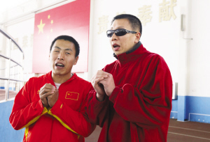 北京残奥会冠军李端率先唱起了他最喜欢的《超越梦想》。唱到兴奋时,李端右手微张,颇有明星范儿。