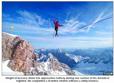 据英国《每日邮报》1月26日报道,现年51岁的奥地利男子海恩斯·扎克是一名热衷于挑战极限的登山家和摄影师,他曾完成多项让人瞠目结舌的高空走钢丝特技表演。日前,“钢丝达人”海恩斯又完成了一项惊人壮举。他在德国最高山峰、1746米高的楚格峰山顶吊起一根钢丝并从上面走过,甚至在没有系安全绳和采取任何保护措施的情况下在钢丝上徒手走了10米。