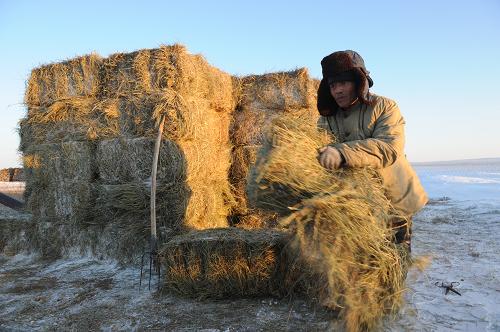 1月15日,一名牧民在内蒙古锡林郭勒盟苏尼特右旗赛汗塔拉镇都呼木嘎查(村)的棚圈旁取救灾草料。连日的寒潮和暴风雪灾害导致内蒙古乌兰察布市、锡林郭勒盟、巴彦淖尔市、赤峰市等地农村牧区生产陷入困境。重灾区之一锡林郭勒盟苏尼特右旗政府救灾部门已紧急调动资金400万元,用于一线3000多户灾民、90多万头(只)牲畜过冬。截至1月16日,已调运并发放草料1000多万公斤,目前苏尼特右旗灾区仍有50多万头(只)牲畜越冬困难。新华社记者 张领 摄
