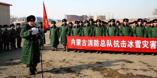 1月18日,内蒙古自治区公安消防总队“冰雪灾害抢险救援突击队”队员们在出征动员仪式上宣誓。当日,内蒙古自治区公安消防总队和锡林郭勒盟、乌兰察布市、呼伦贝尔市三地的消防支队相继成立了“冰雪灾害抢险救援突击队”,以应对近期的冰雪灾害。突击队将充分发挥消防部队人员、装备和技术优势,深入到灾区的铁路、公路沿线和边远农村牧区,开展铲除积雪、打通道路、抢救被困群众、为受灾地区运送食物及生活用品等行动,切实帮助人民群众解决因灾害天气造成的困难。新华社记者 王宇天 摄