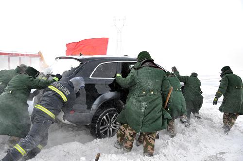 1月22日,消防战士正在将一辆被困车辆从雪窝里推出。因受大风降雪袭扰,从当日清晨开始,内蒙古自治区呼(和浩特)海(拉尔)省际大通道S105化德县与正镶白旗之间的部分路段陆续被大雪掩埋,并造成上百辆汽车被困,幸无人员伤亡。新华社发(田瑜 摄)