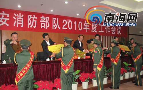 南海网1月28日消息(南海网记者陈望):1月28日,海南省公安消防部队召开2010年度工作会议全面总结2009年工作成绩,部署2010年工作任务,表彰年度先进集体和个人。省委常委、政法委书记肖若海出席会议并强调:全省要大力开展消防安全环境综合整治活动,用出色的消防工作保障和服务国际旅游岛建设。