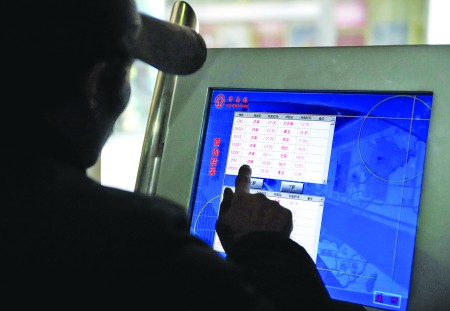 28日,济南火车站售票大厅,一位农民工在通过简单易用的触摸屏查询返乡火车票。信息化时代让所有人都享受到便捷的服务。 周青先摄