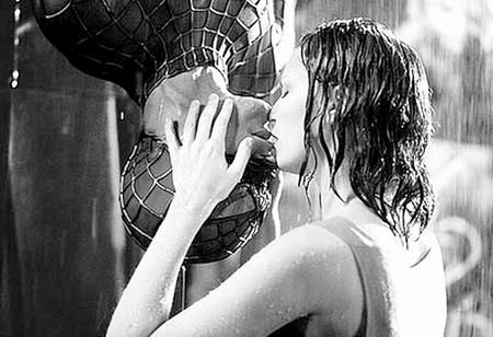 排名第二的是电影《蜘蛛侠》中男女主角托比·马奎尔与克里斯汀·邓斯特在雨中的倒吊接吻(左图②)。