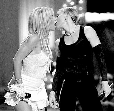 乐坛天后麦当娜跟小甜甜布兰妮在2003年MTV音乐颁奖礼上的同性之吻,高票当选冠军(左图①)。