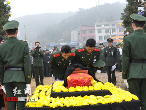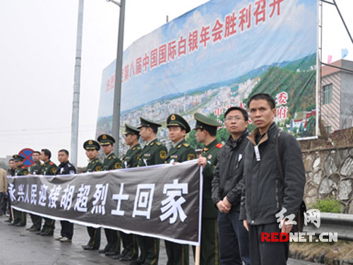 11时40分许,细雨仍朦朦不止,人却越聚越多,当一辆载着胡超烈士骨灰的灵车缓缓驰入人们的视野时,大家凝重的脸庞上不约而同地挂满了泪花,有的忍不住小声地抽泣着。人群中用一双双手拉着的“向烈士致敬”“永兴人民接您回家”、“人民的好儿子”等横幅,诉说着永兴县64万人们对英雄的无尽悲痛和深情呼喊。