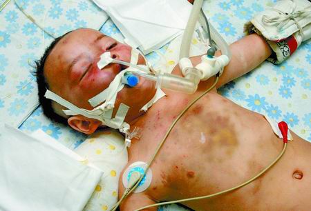 昨天凌晨4时,新郑市120急救中心接到八千乡卫生院的求助电话,说有一个两岁的小男孩遍体鳞伤,陷入昏迷,情况非常危急。新郑市人民医院立即派出急救车将孩子接回。当时,孩子嘴唇发紫、气若游丝。