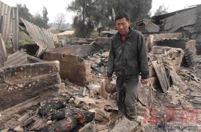 面对被烧得一片狼藉的猪圈,他的眼泪都掉出来了