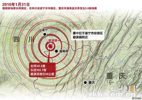 据国家地震台网测定,北京时间2010年1月31日5时36分,在四川省遂宁市市辖区、重庆市潼南县交界(北纬30.3度,东经105.7度)发生5.0级地震,震源深度约10公里。
