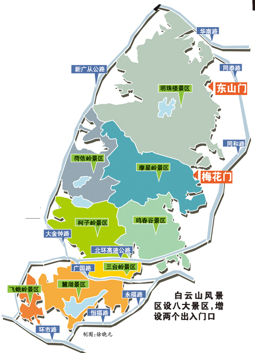 除了现有的南山门、西山门、柯子岭门和濂泉门外,白云山将增设东山门(白云山制药厂附近,距广州大道北五六百米)、梅花门(梅花园附近,距广州大道北600-800米远)作为风景区辅助出入口。