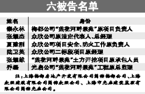 上海消息 昨天上午,轰动一时的上海“楼脆脆”案在闵行区法院第二法庭开审,“莲花河畔景苑”工程项目负责人、承建方、监理等6名被告被控涉嫌重大责任事故罪。开发商梅都公司原法定代表人张志琴、梅陇镇原“镇长助理”阙敬德将在上海市一中院另案处理。
