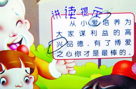 赵先生告诉记者,他买的是“宝宝第一本精典童话”丛书中的一本《神笔马良》。仔细翻看,错误百出。在“从小爱培养为大家谋利益的高兴品德”(如图)这一句话中,居然出现两处错误:其中“从小爱培养”中的“爱”应为“就”;“高兴品德”中的“兴”,应为“尚”。该书中为“哪吒”的“哪”注音竟是“na”……