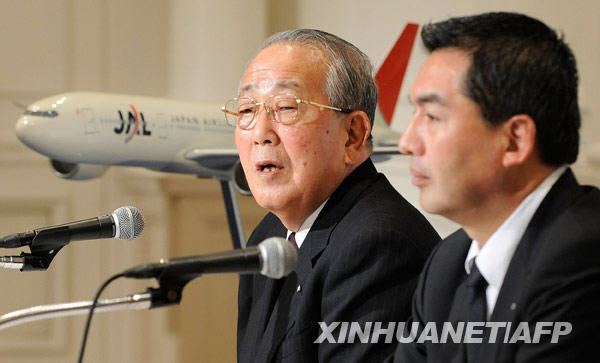 2月1日,在日本首都东京,日本航空公司新任总裁稻盛和夫(左)出席新闻发布会。