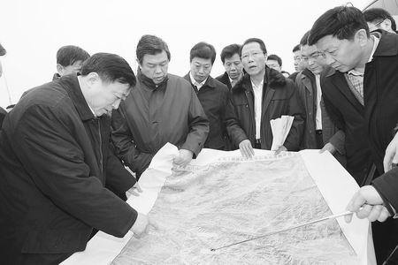 铁道部的有关领导在运十高铁卢氏县车站选址现场查看。