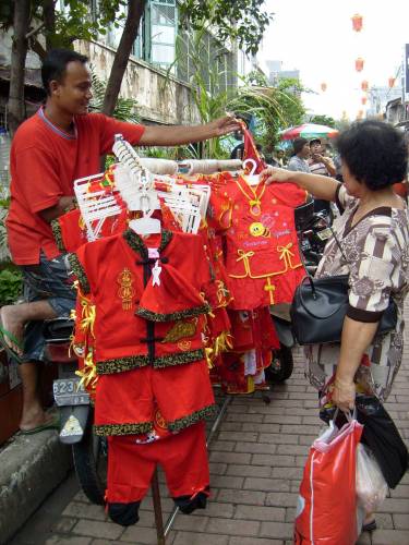 访印尼华人商业区班芝兰:红彤彤服饰迎虎年(图)