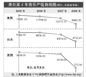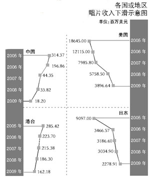 以美国为例,2008年唱片收入相比2005年,相差128.87亿美元,平均下滑32%。港台加起来的唱片收入,4年间平均以13%的速度下滑。中国内地的唱片收入下滑指数更为明显,并且这个收入少的可怜:2005年唱片收入连美国的百分之二都不到。