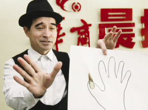 所谓意念魔术“烧手指”,就是嘉宾站在一旁,点着白纸上画好的魔术师五指中的一指,然后用心冥想。而此时,嘉宾在纸上点燃的那只手指,所对应的,魔术师那只手指就会被烧出一个水泡。