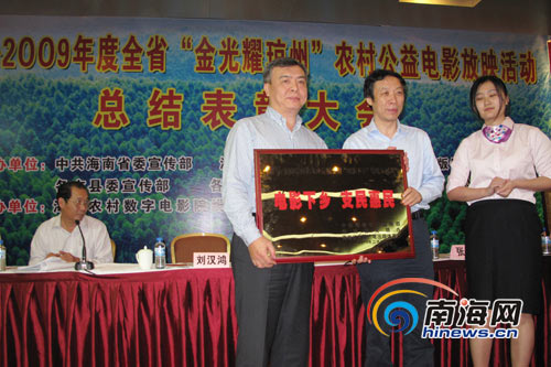 在今天上午的表彰大会上,主办方为“电影下乡”特殊贡献单位海南金海浆纸业有限公司赠送了牌匾,并向各县市农村电影放映活动先进单位颁发了奖项。随后,主办方与该公益活动的赞助单位金海浆纸业有限公司举行了2010至2011年度全省“金光耀琼州”农村电影公益放映活动的捐助签约仪式。新一轮的电影放映将从今年2月持续到明年2月。