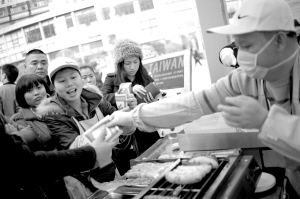 昨天上午在日月光广场正式开展的中华名特小吃展销会可以说将“狂吃”主题表现得淋漓尽致,2月20日之前,市民们将能够在这里品尝到来自全国各地的风味小吃,如贵州牛肉粉、鲜活大闸蟹、川北凉粉、金钩抄手、狗不理包子。活动还隆重推出了不少以前总是在综艺节目上得见的台湾名小吃,士林夜市有名的蚵仔煎、章鱼丸子,还有极具异域风情的印度飞饼和韩国打糕等。