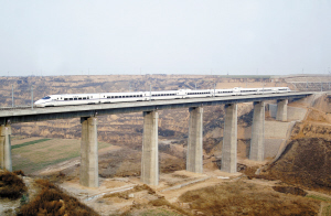 2005年9月25日开工建设的郑州至西安高速铁路是《中长期铁路网规划》“四纵四横”徐州至兰州高速铁路的重要组成部分,线路全长505公里,工程概算353.1亿元。全线共设郑州、荥阳南、巩义南、洛阳南、渑池南、三门峡南、灵宝西、华山北、渭南北及西安等10个客运站。在试运行中,国产CRH3“和谐号”高速动车组最高时速达到了394.2公里。