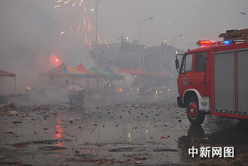 河南延津近10家烟火摊发生火灾 面包车被引燃(图)