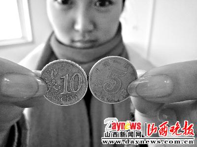 随后,记者又带着这枚硬币来到中国银行山西省分行,一位出纳员经过仔细查看后告诉记者,这确实是枚10欧分的欧元硬币。1欧元约等于9.4元人民币,10欧分约等于0.94元人民币。因为欧元硬币在中国是不流通的,所以出现在超市,可能是有居民出国带回来后,购物时误当5角钱花了。