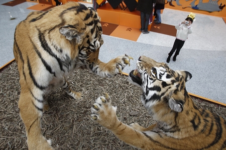 此次展示由“人与老虎”、“老虎之路”、“透视老虎”和“保护老虎”四个展示主题组成,除了展示富有传统中国特色的剪纸、手工艺制品外,还展出了十一件猫科动物的标本,系统展示虎与其他猫科动物的联系。其中,两件东北虎标本尤其具有特色,两虎搏斗的画面栩栩如生。俞立严潘则成