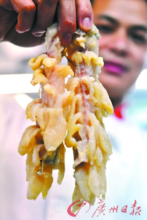 白鳝是鳗鱼的一种,学名鳗鲡,又称河鳗,肉质细嫩、肥润、味道鲜美,也是新派粤菜“生猛海鲜”一族中备受食客追捧的名贵鱼类之一;红酒本身就是浪漫和煽情的代表,由金城酒店名厨关志忠现场示范这款用红酒焗白鳝。