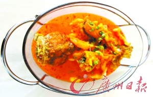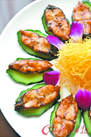 由鲍国演义副总厨李加荣教授的这款松子桂花鱼,采用中西合璧式做法,外表色泽金黄,寓意财源广进红红火火;鱼味酸甜,微带辣味,肉质细腻,入口即化,且没有骨头,老人、小孩均可以食用。