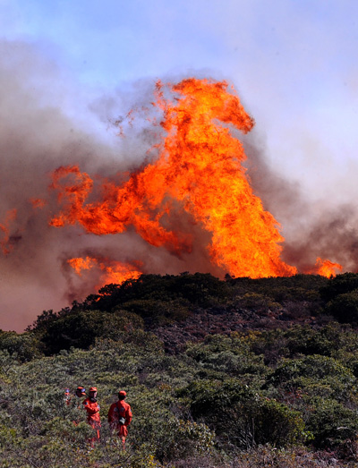 张祖林昨日赶赴救火一线督战,力争今日扑灭明火。图为石林杨梅山山火现场 新华社
