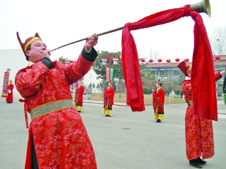 曲阜孔子六艺城景区演员在排练开城迎宾礼。