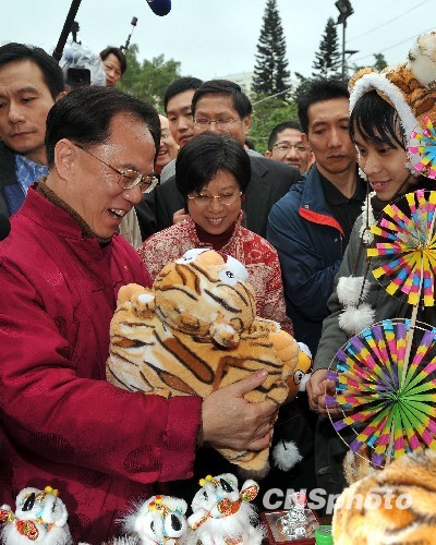 随后,他又去到一间名为“礼宾虎”的售卖毛绒老虎的摊位,并买下两件毛绒老虎。这间摊位名称与特首官邸“礼宾府”谐音。曾荫权并不介意,他说,这是好事,很有创意。