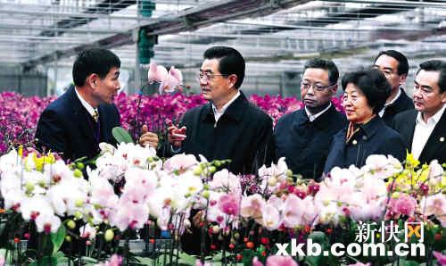 胡锦涛首先参观了设在创业园的漳州钜宝生物科技有限公司花卉基地。这家企业两年多前到创业园投资兰花产业,去年生产了500万株蝴蝶兰,取得了很好的经济效益。胡锦涛一下车,就握着公司董事长、台南兰花协会原理事长黄瑞宝的手,笑着对他说:"我来给你们拜年了!"