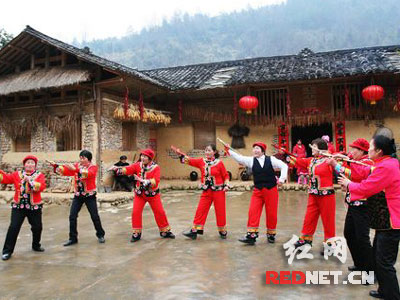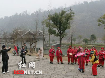红网长沙2月16日讯(通讯员 邓道理 毛建初)2月14日,虎年春节,普天同庆,世界自然遗产张家界黄龙洞景区喜气洋洋。当天数名身着节日盛装的原住居民在黄龙洞生态广场表演的土家族花灯舞、山歌联唱、三棒鼓等民俗节目,让参观黄龙洞的海内外游客倍感惊喜,赞叹张家界之旅不仅可以饱览世界罕见的山水奇观,还可以感受历史悠远、风格独特的民族文化。