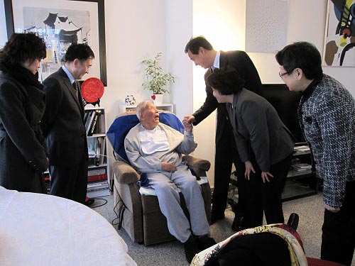去年朱德群先生患中风住院,孔泉曾前往医院探望,此后一直甚为挂念。朱先生大病初愈,语言能力尚未恢复,见孔泉夫妇来访,即面露喜色,与孔泉夫妇亲切握手,频频点头致意。孔泉向朱先生的夫人详细了解他的治疗和恢复情况,并祝愿他虎年心情愉快,早日康复。朱先生十分牵挂将于3月4日在中国美术馆开幕的“朱德群艺术回顾展”。孔泉表示,这是朱先生一生成就的回顾,又逢朱先生90寿辰,对中法文化交流和朱先生本人均有重大意义,驻法国使馆将一如既往给予支持和推动,他本人也将尽可能出席开幕式。朱夫人及其家人对孔泉夫妇来访和对筹备此次展览所提供的帮助表示衷心感谢。
