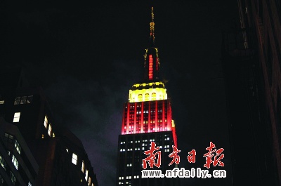 纽约帝国大厦为中国春节亮灯 南方日报 2010.02.1808:31 关注 2月16日,美国纽约帝国大厦亮起象征中国的红、黄两色灯光,庆祝中国传统新春佳节。从2000年起,帝国大厦每年都为中国农历新年亮灯。当日,中国驻纽约总领事彭克玉为该大厦拉闸亮灯。 新华社发