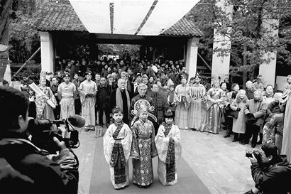 在草堂大廨,两位身着古装的“高适”、“杜甫”相对吟诵《人日寄杜二拾遗》和《追酬故高蜀州人日见寄》,如此装束和吟诵颇具特色,如古装大片般在人们眼前上演。