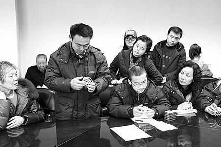 2月20日上午,来自全国各地的200多位魔友齐聚本报会客厅,其中不乏魔方高手,他们观看了孟东阁的“321通用魔方围成法”后,对其技巧表示叹服;但还原魔方更讲究速度,在随后的两次过招中,孟东阁甘拜下风……