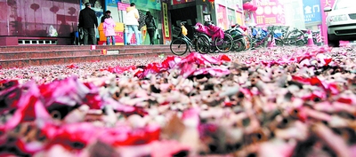 开福区环卫管理部门的工作人员汤正明告诉记者,昨日的鞭炮屑数量不比除夕那天少,“开门炮”给清运工作带来了很大的麻烦。
