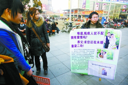 “难道残疾人就不能有爱情吗?养父,求您还我未婚妻梁二玲!”昨日下午5时许,“最牛乞丐”夏海波在二七广场打出了这张海报。