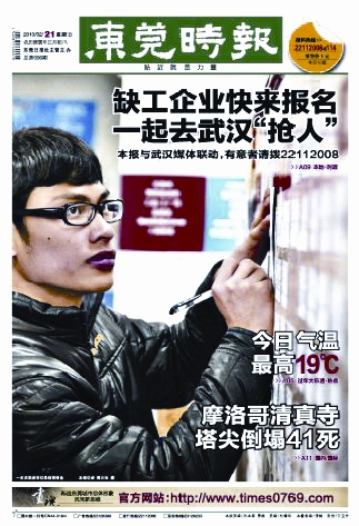 ▲昨日,《东莞时报》一版大篇幅报道与《武汉晨报》一起帮湖北农民工找工作活动。